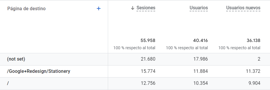 En GA4 el (not set) puede aparecer para la dimensión de landing page o página de aterrizaje cuando la sesión no tiene asociado un evento de page_view. El page_view es crucial para GA4 ya que afecta a muchas otras dimensiones y métricas.