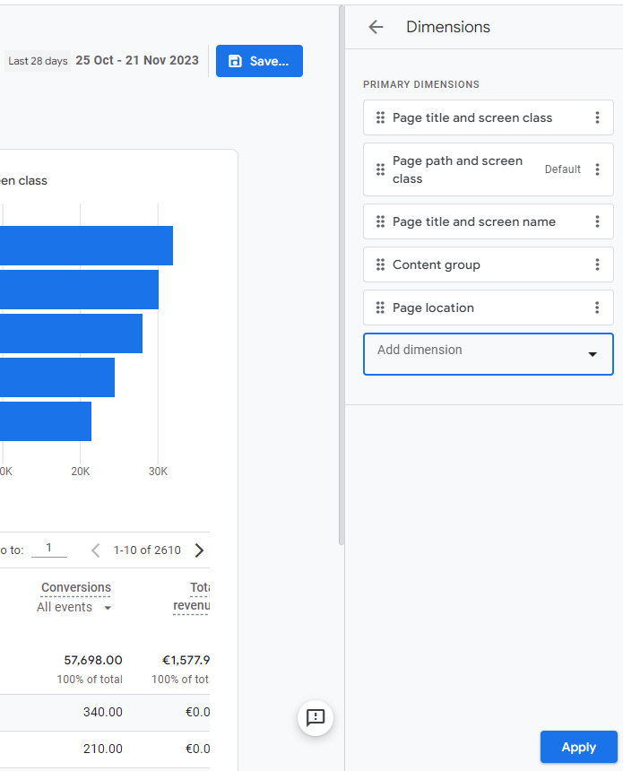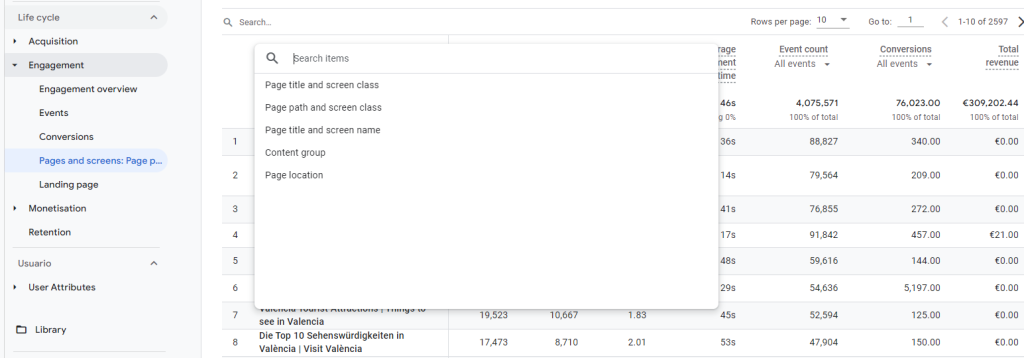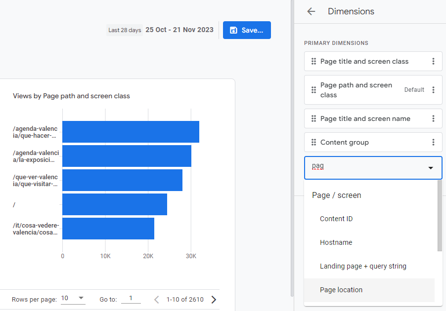 - Una vez que estemos de vuelta en el informe de Páginas y Pantallas, mostramos el listado de DIMENSIONES y seleccionamos PAGE LOCATIONS o UBICACION DE PÁGINA