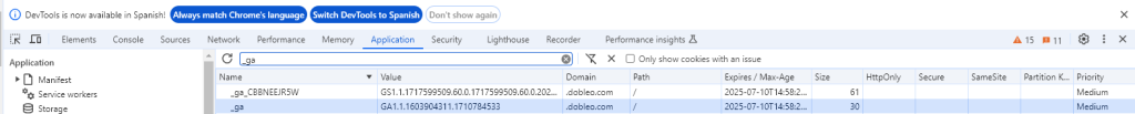 El dominio de la cookie es el dominio en el que se configura la cookie _ga de Google Analytics. De forma predeterminada, la cookie se establece en el dominio de nivel superior. Entonces, si configura una cookie en el dominio de nivel superior como www.dobleo.com, el dominio de la cookie sería ‘dobleo.com’ (sin el prefijo ‘www.’).