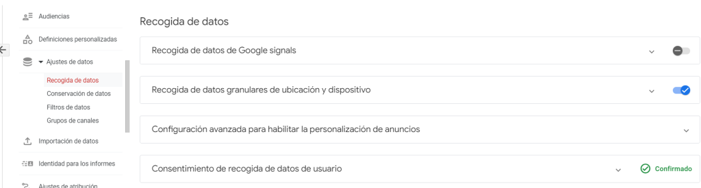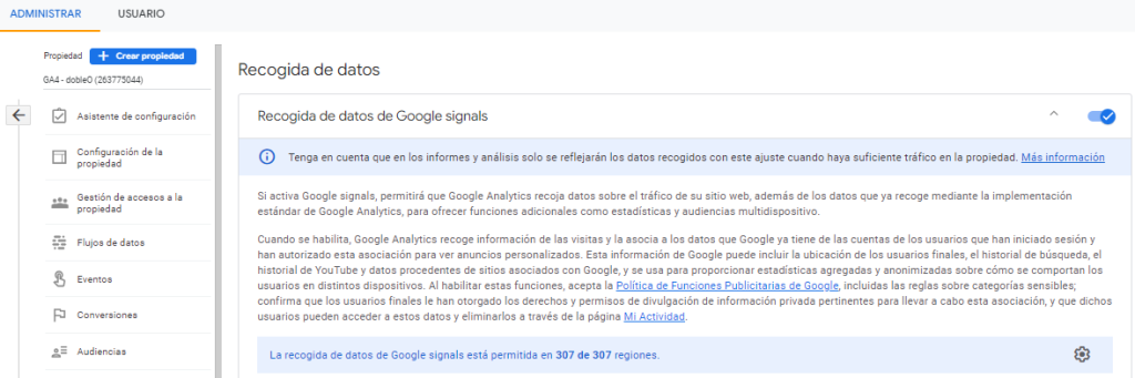 Es importante destacar, que Google Signals NO están habilitadas de forma predeterminada en GA4 y que debemos activarla nosotros mismos.