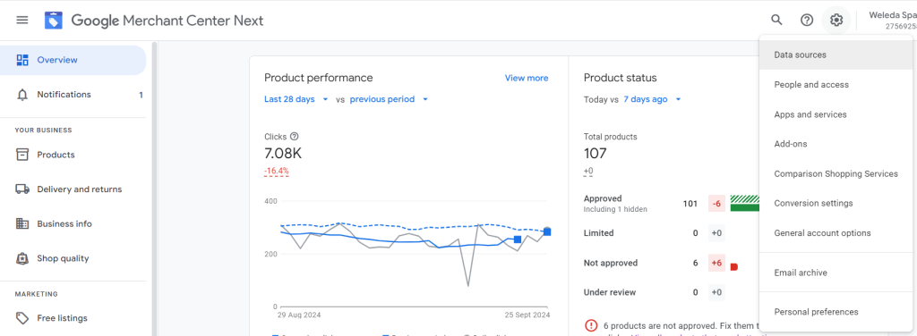 - Catálogo de productos: Puedes gestionar tus productos directamente en Merchant Center, editar información, crear promociones y configurar reglas de envío.