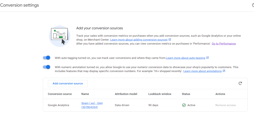 - GA4: Configura las conversiones en GA4 para que coincidan con las etiquetas de conversión de Merchant Center.