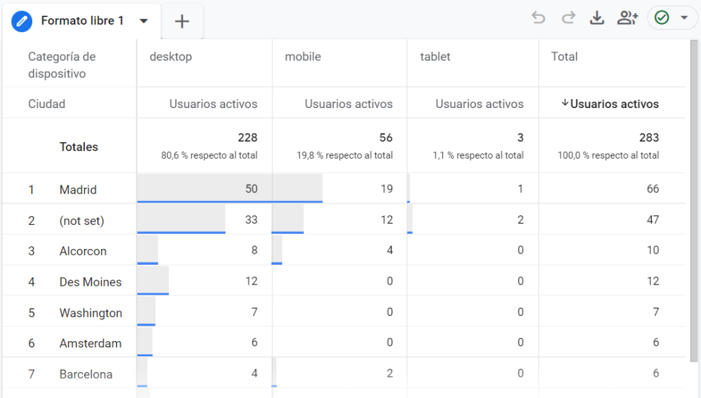 El informe de forma libre presenta los datos en un diseño de tabla dinámica, dando la opción de organizar filas y columnas como desee y aplicar segmentos y filtros personalizados para refinar sus datos. En GA3, teníamos la opción de crear un informe personalizado en la opción de menú de personalización pero eran bastante limitados y estéticamente mejorables. El informe personalizado de GA4 se reemplaza con el informe de exploración.