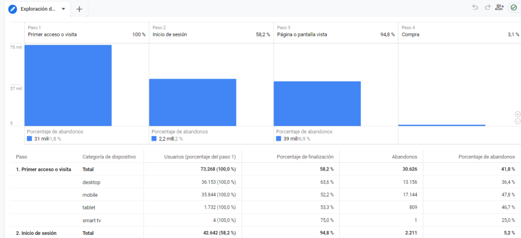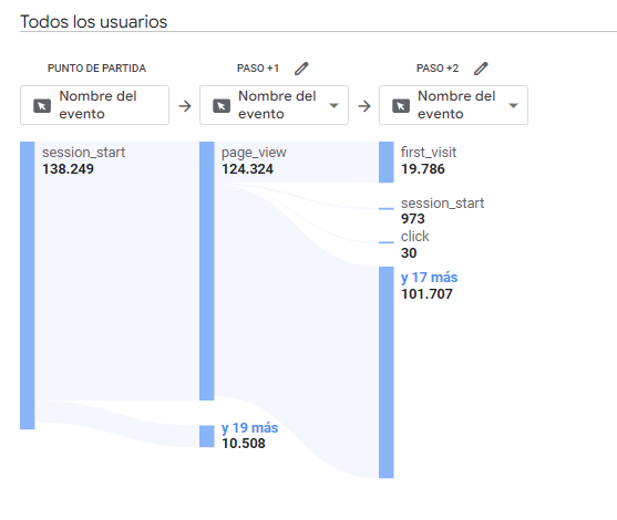 Esto puede ser muy útil para identificar problemas o oportunidades. Por ejemplo, si ves que un gran número de usuarios están abandonando tu sitio web en una determinada página, puedes investigar para ver por qué y tomar medidas para solucionarlo. O, si ves que un gran número de usuarios están realizando una determinada conversión, puedes invertir más en esa conversión.