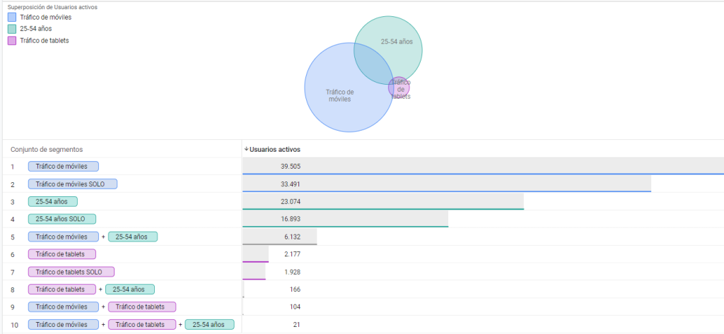 El informe de superposición de segmentos le permite comparar hasta tres segmentos de usuarios y ver cómo se superponen y relacionan entre sí. En otras palabras, es una técnica de análisis que visualiza la relación entre múltiples segmentos de usuarios. El informe «Superposición de segmentos» le ayuda a comprender audiencias específicas aislándolas en función de segmentos complejos y/o avanzados. Luego, puede crear nuevos segmentos en función de sus hallazgos, que puede aplicar a otras técnicas de análisis e informes.