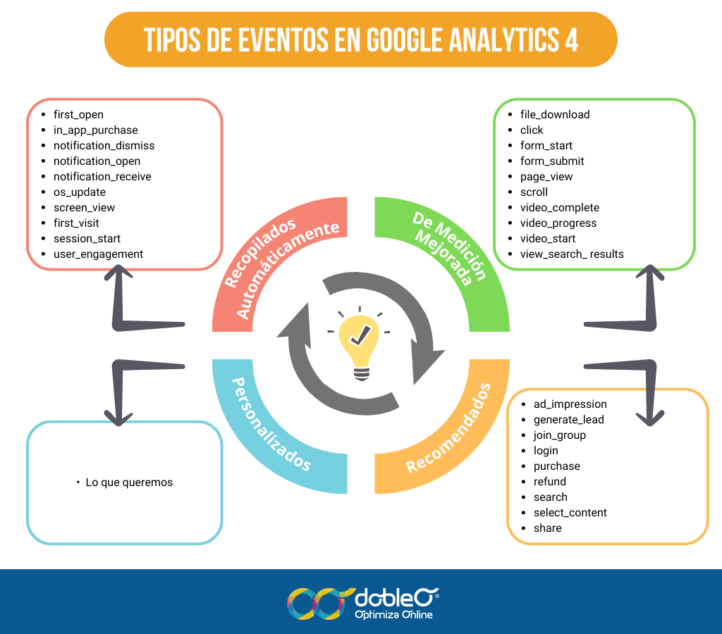 Existen distintos tipos de eventos organizados en cuatro categorías. Veamos cuáles son los tipos de eventos que existen en GA4: