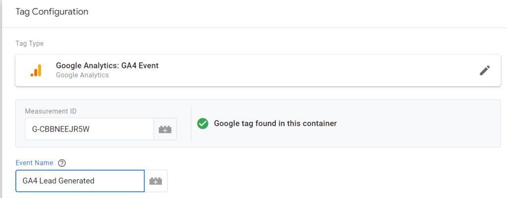Paso-8: Especifica el nombre del evento. El nombre del evento que proporciones aquí aparecerá en tus informes de GA4 Analytics. En nuestro caso, estoy dando el nombre ‘GA4 Lead Generated’.