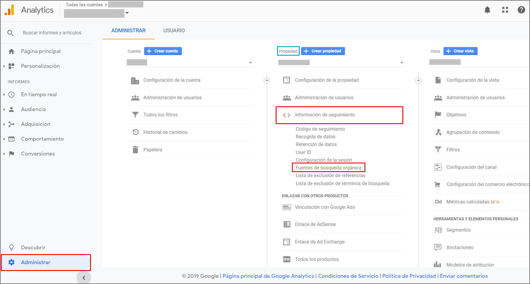 2/ En la columna PROPIEDAD > hacer clic en Información de Seguimiento > Fuentes de búsqueda orgánica.