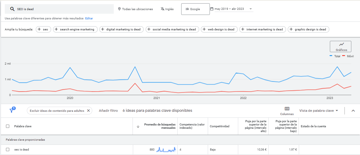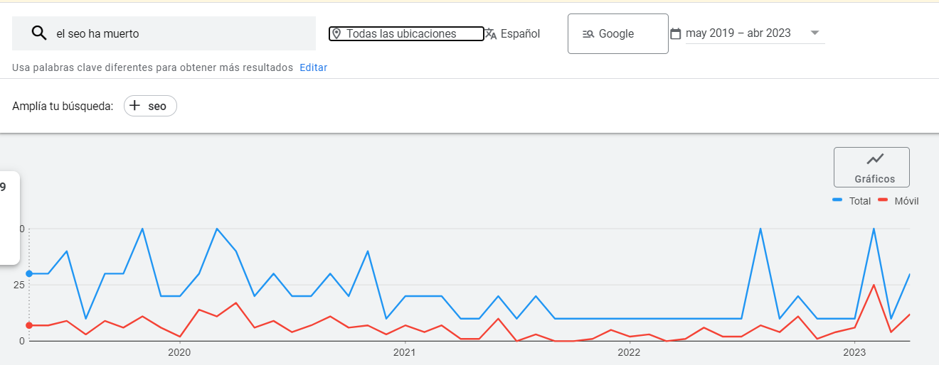 Para darle un poco de perspectiva, debo decir que esto de «El SEO ha muerto» tengo años escuchándolo, de hecho, me ha dado por buscar el volumen de búsquedas de esta query y su volumen se mantiene constantes desde el 2019:
