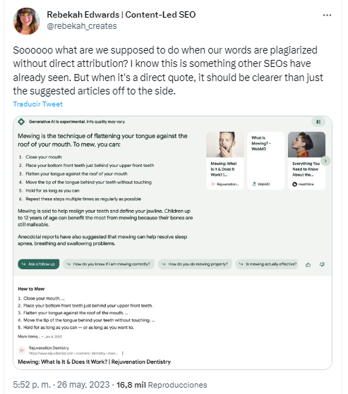 @lilyraynyc también cuestiona como la IA toma contenido de otras webs y lo plagia directamente sin mención al autor:Captura de pantalla 2023-05-31 104831