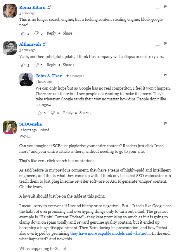 Y lo mejor se deja para el final, veamos algunos comentarios dentro de la propia noticia del posts de seroundtable.com: