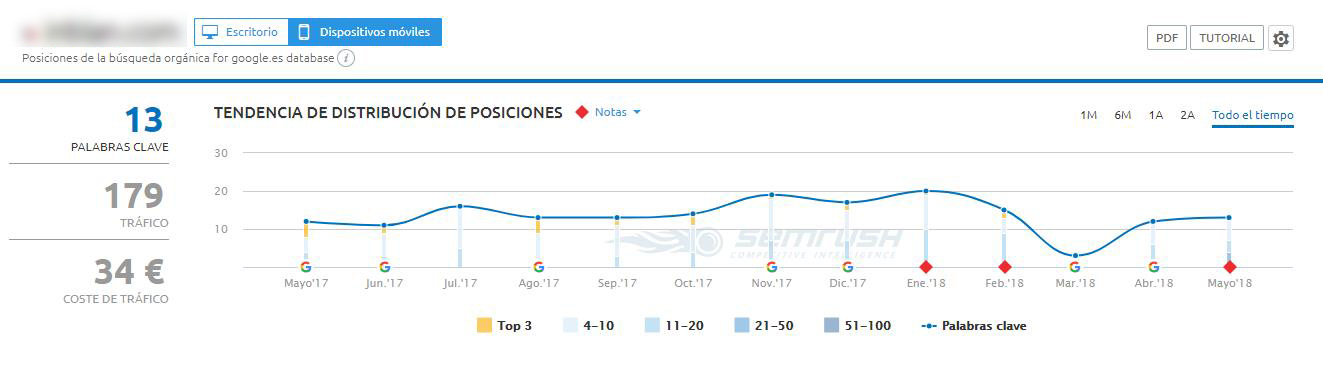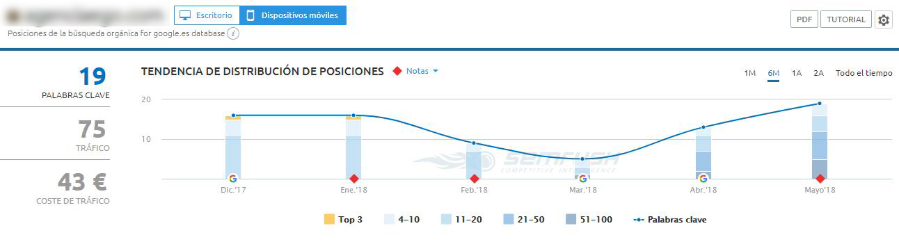 En este otro ejemplo de cliente las posiciones en moviles caen bruscamente en marzo cuando hubo la actualización y luego para mayo se ve que busca la estabilidad que tenia para febrero.