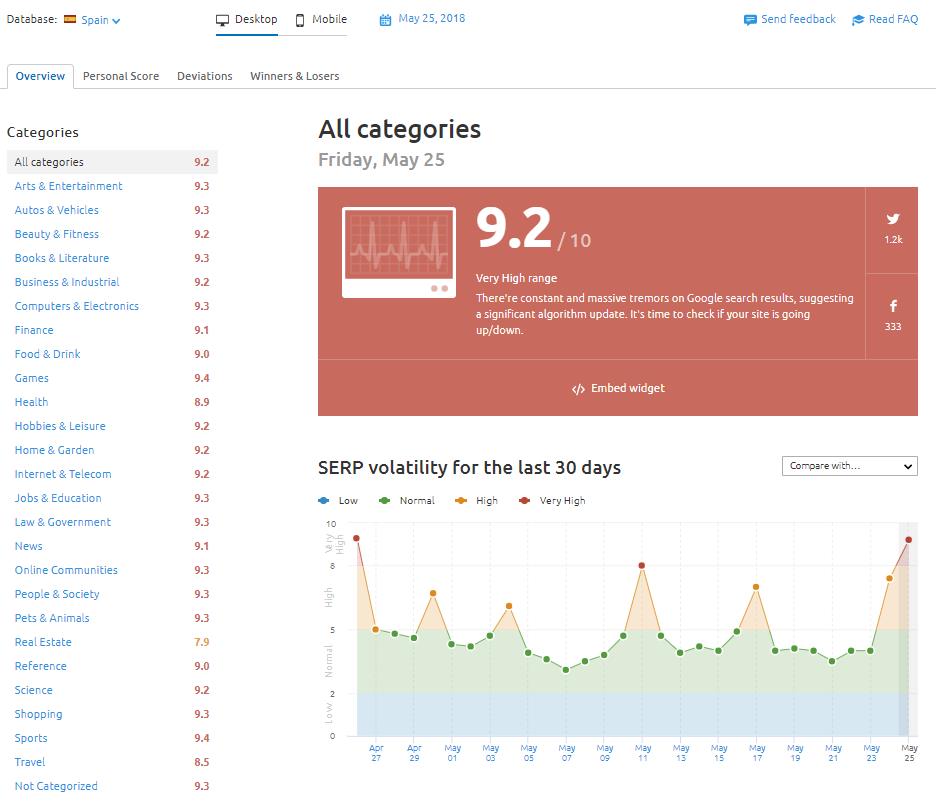 El día de ayer 24 de Mayo hubo una alta fluctuación en los resultados de Google, llegando a marcar la herramienta de SEMRUSH un 9.2/10 de volatibilidad, que se considera bastante alto.
