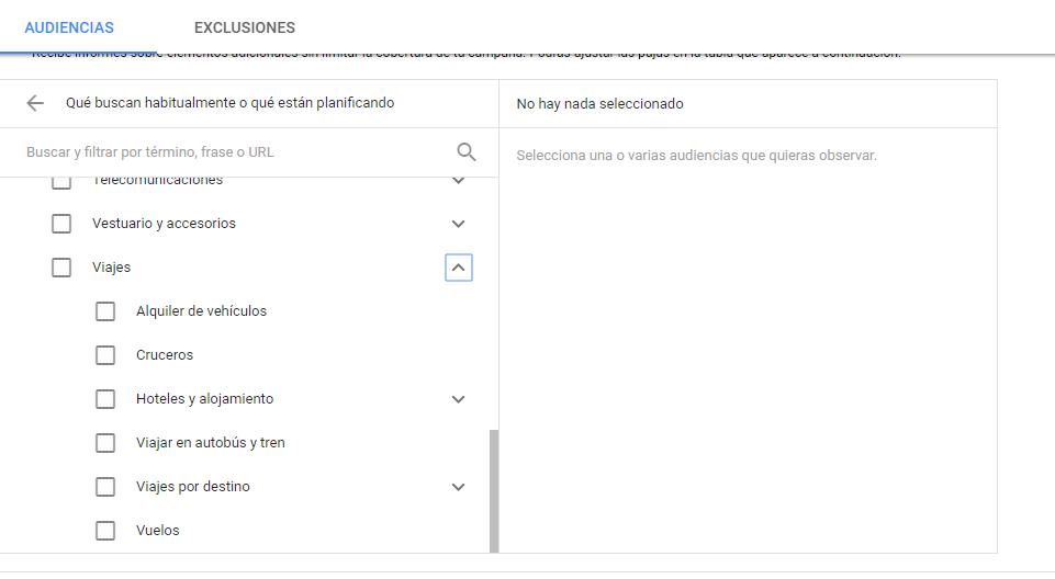Pero la historia no acaba allí, el nuevo Adwords tiene una sección de audiencias, que está definida por las búsquedas que están haciendo los usuarios sobre un tema en específico. Los temas están divididos por categorías, así que es fácil identificar cual de todas las audiencias disponibles nos interesa.