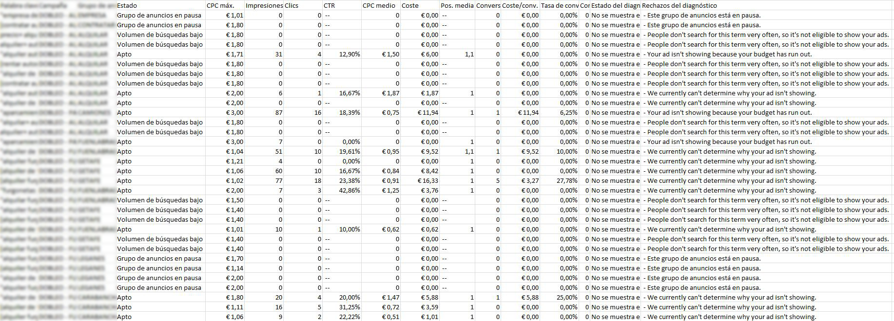A través de un informe, Adwords nos indica las razones por las cuales los anuncios no se están activando con ciertas palabras. Entre las razones que nos proporcionan se encuentran:
