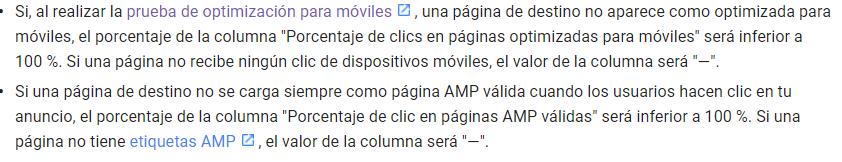 Para conocer el desempeño de nuestras landings debemos seleccionar “página de destino” y revisar la columna “% de clics en páginas optimizadas para móviles” y “% de clics en páginas AMP válidas”.