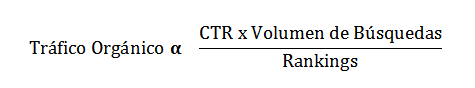 El tráfico orgánico depende de los siguientes factores:Esto significa que la cantidad de tráfico orgánico es directamente proporcional al CTR y al volumen de búsquedas (mientras mayor sea el CTR o más búsquedas se generen para una búsqueda determinada, mayor tráfico orgánico se genera) pero inversamente proporcional a los rankings, ya que mientras mayor sea el ranking (es decir, peor sea la posición) menos tráfico orgánico generaremos.