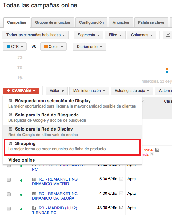 La configuración de la campaña en AdWords es la habitual, aunque aquí no es necesario crear anuncios, ya que Google los generará automáticamente con la información proporcionada en tu feed. A la hora de crear la nueva campaña, se debe seleccionar el tipo de campaña “Shopping”.