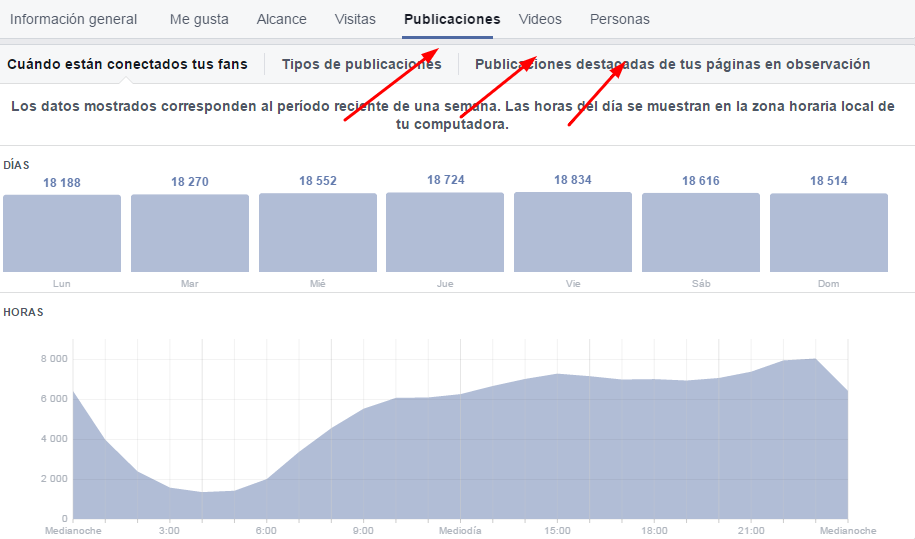 Cuándo están conectados tus fans: muestra un gráfico que nos permite saber las horas del día de cada día de la semana a las que se conecta el público.