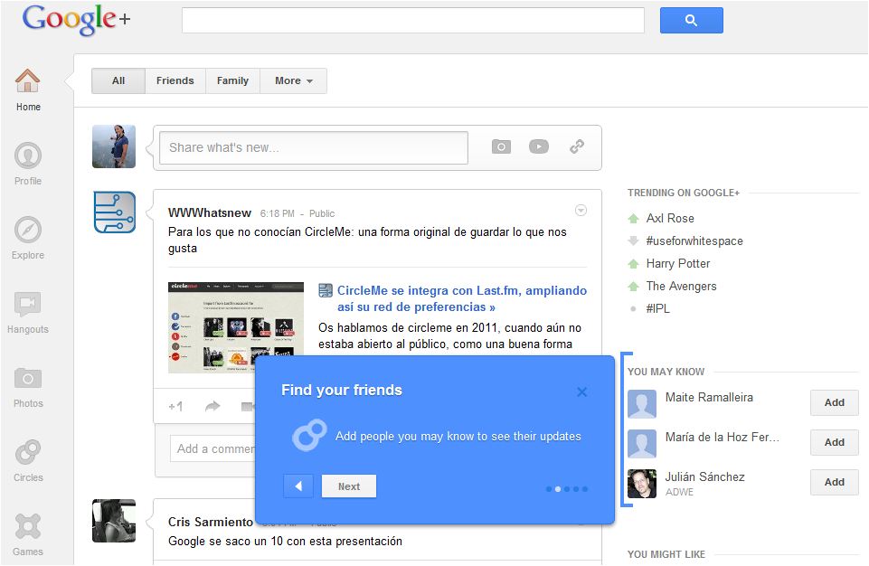 En la Home los de Google han querido resaltar los contenidos de cada uno de tus círculos. Han ubicado las pestañas de All, Friends o Family en la parte superior para poder acceder de forma fácil y rápida. Otro elemento destacable es que en cada momento se actualizan los Trending de Google+. Puedes visualizar los hashtags que han subido o bajado en importancia en la Red Social.