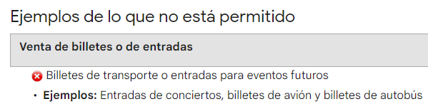 Y es que en este sentido, Google Merchant es tajante, y en esta página indica todo lo que está prohibido, entre ellos, entradas o billetes: