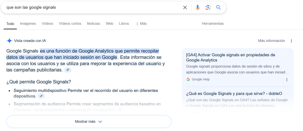 En muchas búsquedas informacionales, podemos ver como se hace mención, en este caso a nuestra agencia de marketing dobleo cuando alguien busca «que son las google signals«