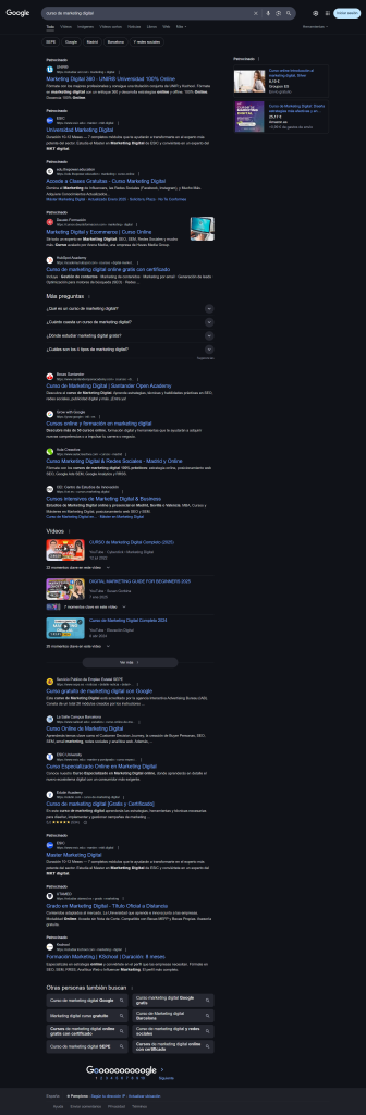 En una búsqueda tan competitiva como es «curso de marketing digital» podemos observar que el resultado del ESIC se observa 2 veces, en una SERP con múltiples formatos (GBP+Ads+SEO+Shopping+Videos+FAQs).