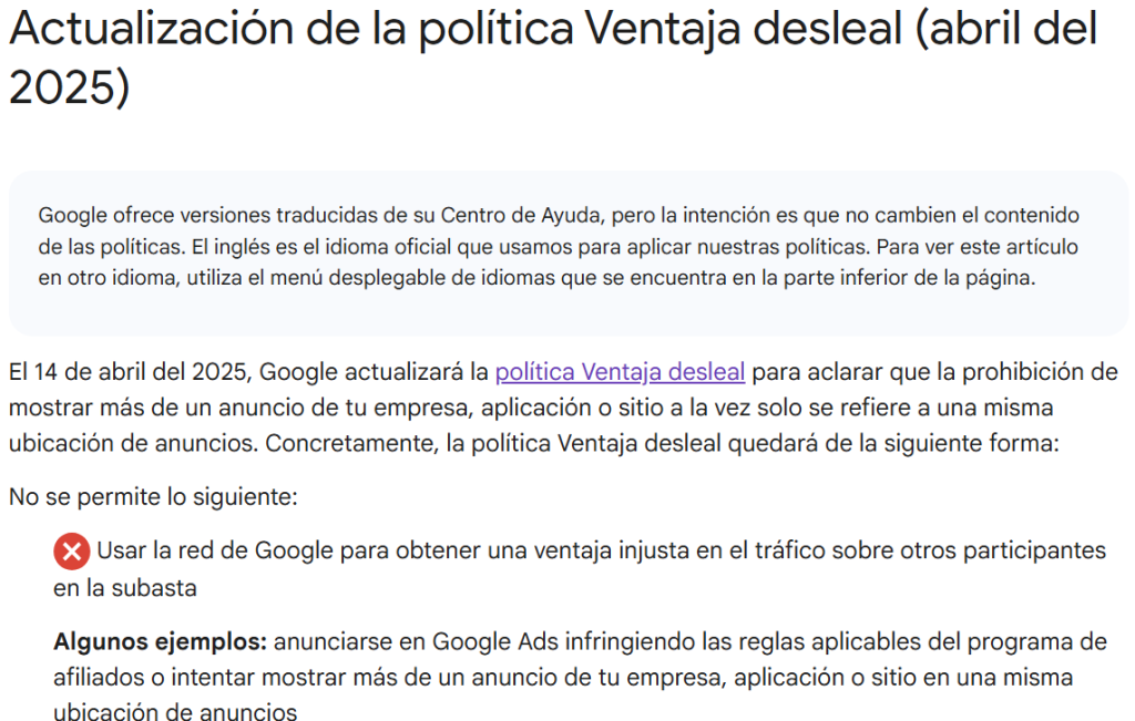 «El 14 de abril del 2025, Google actualizará la política Ventaja desleal para aclarar que la prohibición de mostrar más de un anuncio de tu empresa, aplicación o sitio a la vez solo se refiere a una misma ubicación de anuncios.«