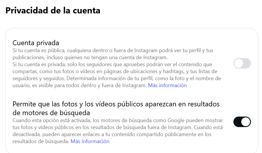 - Opción activada: Ajustes → Privacidad → Contenido visible en motores de búsqueda.