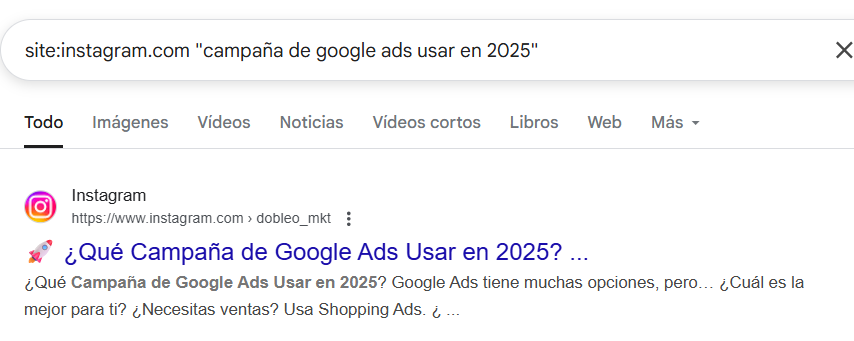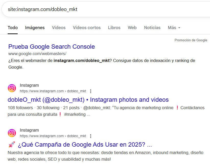 site:instagram.com/nombredetuusuarioPor ejemplo:site:instagram.com/dobleo_mkt - Si tu perfil y publicaciones aparecen, ¡estás indexado!