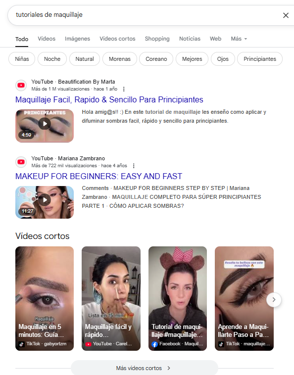 Como podemos observar en la imagen, vemos resultados de Facebook, Instagram, Pinterest, TikTok y Youtube.