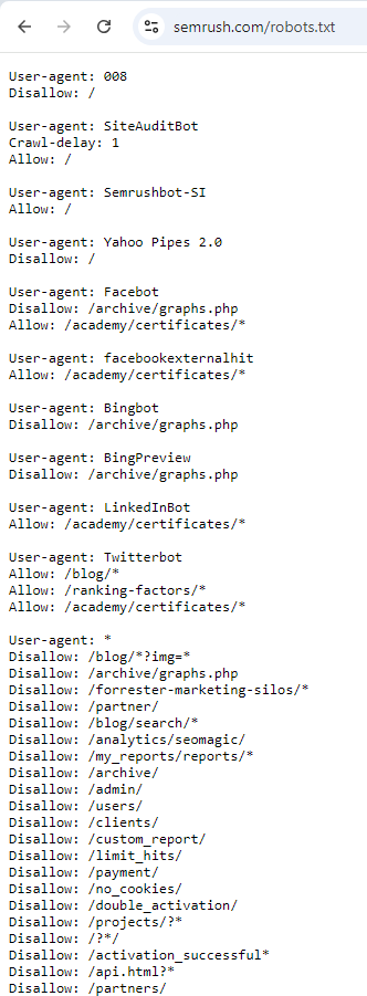 - User-agent: Especifica el robot al que se dirigen las instrucciones (ej: Googlebot). En el ejemplo de Semrush, vemos los siguientes user-agents: 008; SiteAuditBot; Semrushbot-SI; Yahoo Pipes 2.0; Facebot; facebookexternalhit; Bingbot; BingPreview; LinkedInBot; Twitterbot y finalmente * (que son reglas que aplica a todos los robots.)