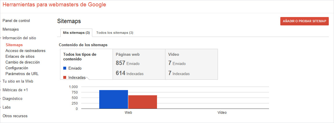 - La información de las páginas enviadas y las indexadas se ha dividido en función del tipo de sitemap: Web, imágenes o video. Además muestra un gráfico donde veremos de forma más visual la relación entre páginas enviadas/indexadas.